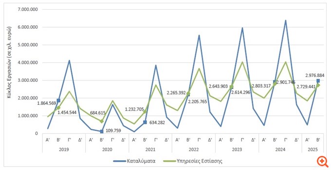 Στο σύνολο των επιχειρήσεων του κλάδου των Υπηρεσιών Εστίασης (κλάδος 56 της ταξινόμησης NACE Αναθ. 2), ο κύκλος εργασιών το δεύτερο τρίμηνο 2025 ανήλθε σε 2.729.441 χιλ. ευρώ, σημειώνοντας μείωση 2,6% σε σχέση με το δεύτερο τρίμηνο 2024, όπου είχε ανέλθει σε 2.803.317 χιλ. ευρώ.