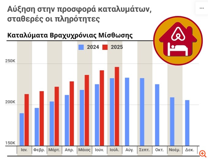 Από την αρχή της φετινής σεζόν σημειώνεται αύξηση στην προσφορά ακινήτων βραχυχρόνιας μίσθωσης. Τον Μάρτιο ο αριθμός των καταλυμάτων διαμορφώθηκε σε 222 χιλ., με αύξηση κατά 18 χιλιάδες, ενώ τον Απρίλιο καταγράφηκαν 228 χιλ. καταλύματα, αυξημένα κατά 16 χιλιάδες. Τον Μάιο η αύξηση συνεχίστηκε, ενώ τον Ιούνιο ο αριθμός των καταλυμάτων ανήλθε σε 242 χιλ., καταγράφοντας νέα άνοδο κατά 17 χιλιάδες σε σχέση με πέρσι. Πάντως τον Αύγουστο και το Σεπτέμβριο δεν έχουμε σημαντικές παρεκκλίσεις, κάτι που είναι αναμενόμενο, καθώς τα καταλύματα είναι ανοικτά κυρίως στην αιχμή της τουριστικής περιόδου.